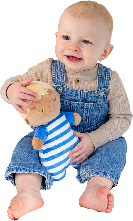 Baby shark, doo doo doo doo doo doo! This soft baby doll plush is a fin-tastic gift for summer newborns. An innovative spin on soft dolls, this snuggly friend comes swaddled in a removable shark-themed blanket. We love the tail fin closure, embroidered felt teeth, and extremely soft pastel blue and white material. The plush blonde baby doll is wearing a striped blue and white onesie, and is ready for hours of interactive play!