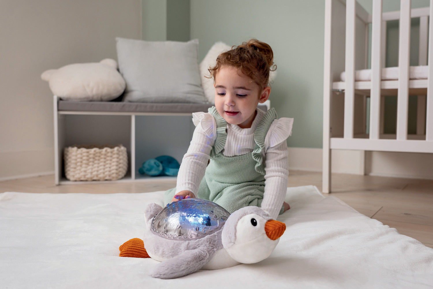 Soothe baby and reassure children who are afraid of the dark with an eco-friendly plush penguin that doubles as a nightlight and sound machine. Tranquil Penguin's back projects a motion waves light effect, comforting dreamers as they drift off to sleep. Choose from 4 soothing sounds: underwater melody, tranquil melody, whale song, or ocean waves. The 23-minute timer ensures complete darkness and silence while children sleep soundly. An intelligent Cry Sensor, with adjustable sensitivity, restarts the Penguin at baby's first cry. All light and sound levels are adjustable. We love that it's rechargeable, made from recycled plastic bottles, and uses FSC certified packaging. USB-C rechargeable, cable not included.