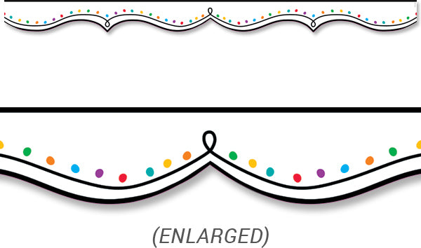 This unique Color-Dotted Swirl Border will trim any bulletin board display in style! Black flourishes and colored dots stand out against the crisp white background on this versatile die-cut bulletin board border that can be used not only in a classroom or at a school but also at an office, a church, a college dorm, or an employee break room.