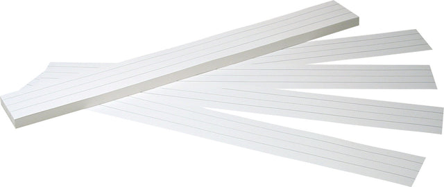 Sturdy, cardstock-quality strips are versatile, easy to handle, and ruled on both sides - so 100 strips instantly turn into 200! Made of tagboard, these strips are 1-1/2" ruled with 3/4" dotted midline on one side and a single line rule on the opposite side. These sentence strips measure 3" x 24" and work great for making headbands with the kids. Film-wrapped packages contain 100 White strips. Recyclable.