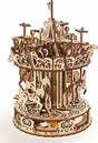 Round and round and back to where it's all beguna¦ Take a trip to your childhood memories with Ugears beautiful nostalgic model, the Carousel, the classic merry-go-round implemented in top-quality sustainable wood. Here you will find two types of carousel horses that rock up and down as the model spins. The core of the model is a center pole that rotates in a direction opposite to the main platform making it look as if the carousel spins faster than it really does and creates the fascinating dynamics of the whole construction. The pole rises over the roof making it visually more delicate and at the same time giving it more volume. Add little birds soaring over the roof of the carousel along with decorative flying lanterns and you may just sense the aroma of hot dogs and cotton candy! The Carousel has a wind-up key under its base that provides tension to the rubber bands attached to the main axle. The pendulum gears down the axle and makes the movement of the modules and details smoother. It is great fun to observe the model in motion, but if you are one of those people who like to see with their hands, you can rotate the Carousel manually. This will allow you to examine every detail in slow motion and give you a full comprehension of how the mechanism works. Put it together, wind it up and we guarantee you will hear that music, feel the buzzing atmosphere of the holiday fair and remember how much joy it was to ride your favourite horse on its happy round and round trip. Model Size: 8.3 x 8.3 x 10.2 in Package size: 14.6 x 6.7 x 1.8 in Number of parts:' 305 Level: Hard Assembly Time: 7 hours Recommended Age: 14+ Kit weight: 2.29 lbs Case Pack: 4 Manufacturer: UGears