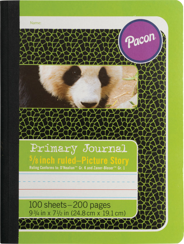 These books help track students’ handwriting progress and is perfect for interactive note taking. Comes with a Green colored cover with a Panda printed on the front for easy color coding and identification, and the inside front cover is printed with the alphabet for reference. 5/8" ruling with 5/16" dotted midline and 5/16" skip space conforms to D’Nealian™ Grade K and Zaner-Bloser™ Grade 1 handwriting programs. 4-1/2" Picture Story space is great for adding illustrations. Each book contains 100 sheets or 200 pages. Recyclable.