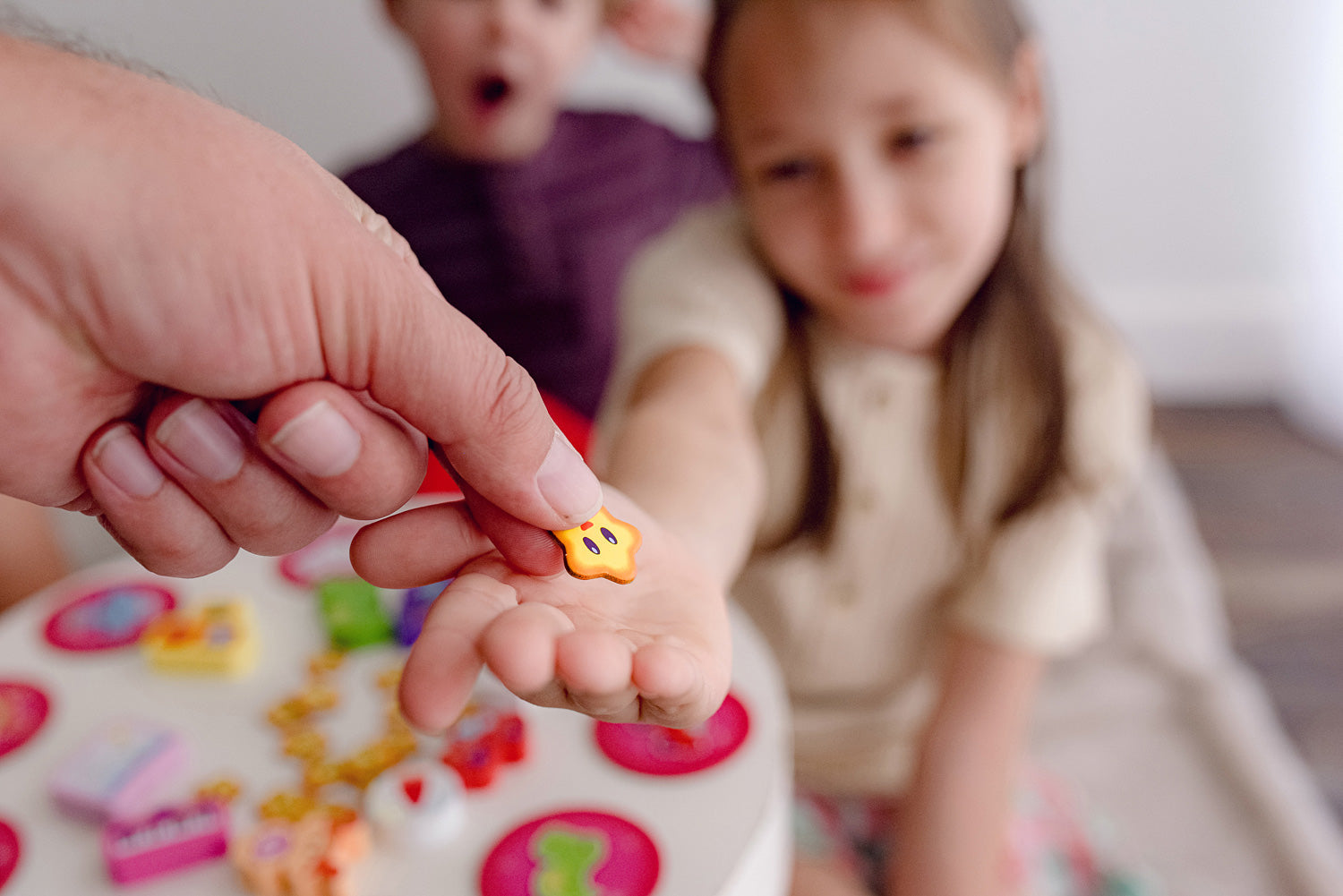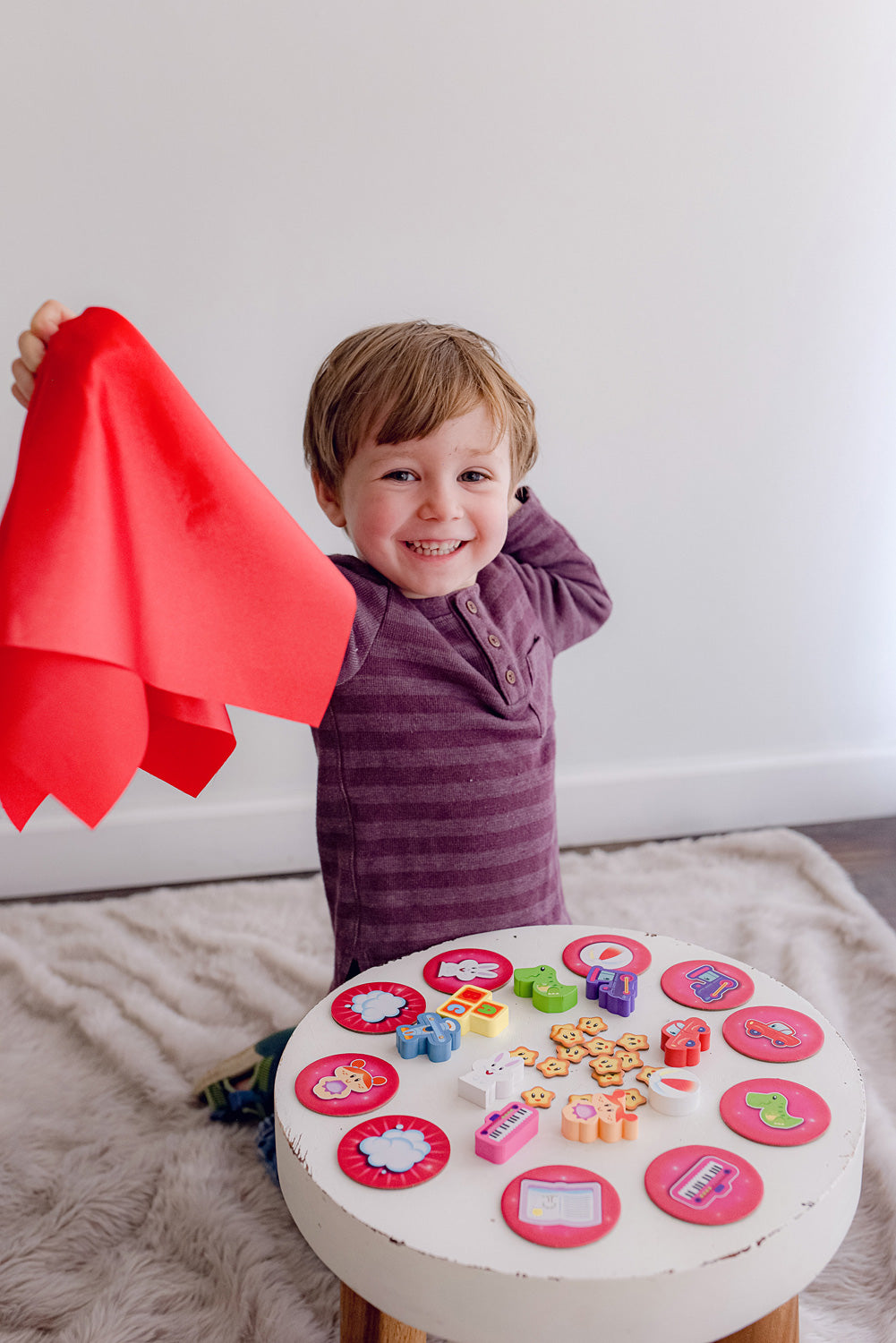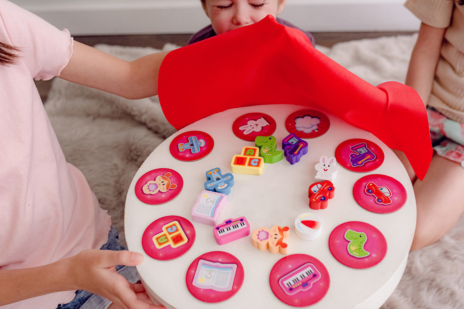Sharpen your preschooler's observation skills with a fun new memory game! Players take turns being the "magician", covering all 10 wooden objects with the magic scarf and pulling an item out. The other players race to determine which item is missing by looking at the corresponding image tiles. The first player to correctly identify the missing object gets a star token, and the player with the most stars at the end of the game wins. Make it more challenging by flipping the tiles over after the items are found, making it harder to remember what all the objects are! For 3-5 players.