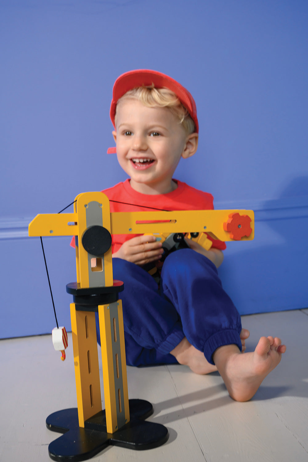 Enter the construction site and get ready to build years of imaginative adventures with this heirloom-quality wooden crane set! Future engineers use the dials to move the crane arm forward and backward and lift the hook up and down. Load the two included construction vehicles onto the platform and lift them into place on other household blocks or structures. Some assembly required.